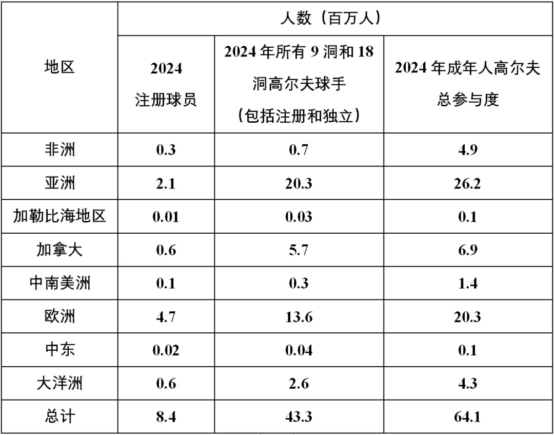 根据《Global Golf Participation Report 2024》12,全球高尔夫球参与人口在地区分布上呈现明显的层次化和结构差异。截至2024年,全球注册高尔夫球员总数为843万人,但参与9洞和18洞高尔夫球(下文简称“标准球手”)的人数已达到4328万人,说明大量爱好者并未加入正式俱乐部或组织,而是以更灵活、非正式的方式参与运动。若进一步扩大统计口径,将包括练习场、模拟高尔夫球等场景下的休闲或初级参与者在内,全球高尔夫球总参与人数已达到1.08亿人,充分体现出高尔夫球运动正在从小众竞技项目向大众健身休闲活动转型。