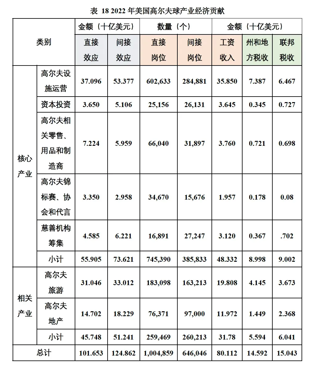 据《2022年美国高尔夫影响力报告》数据显示,2022年美国高尔夫球产业展现出高度成熟和系统化的产业结构,总体经济影响达到2265亿美元。其中,直接经济贡献为1016.53亿美元,间接经济效应达1248.62亿美元,涵盖了核心产业和相关产业两大部分,构建起高度融合的产业生态系统。