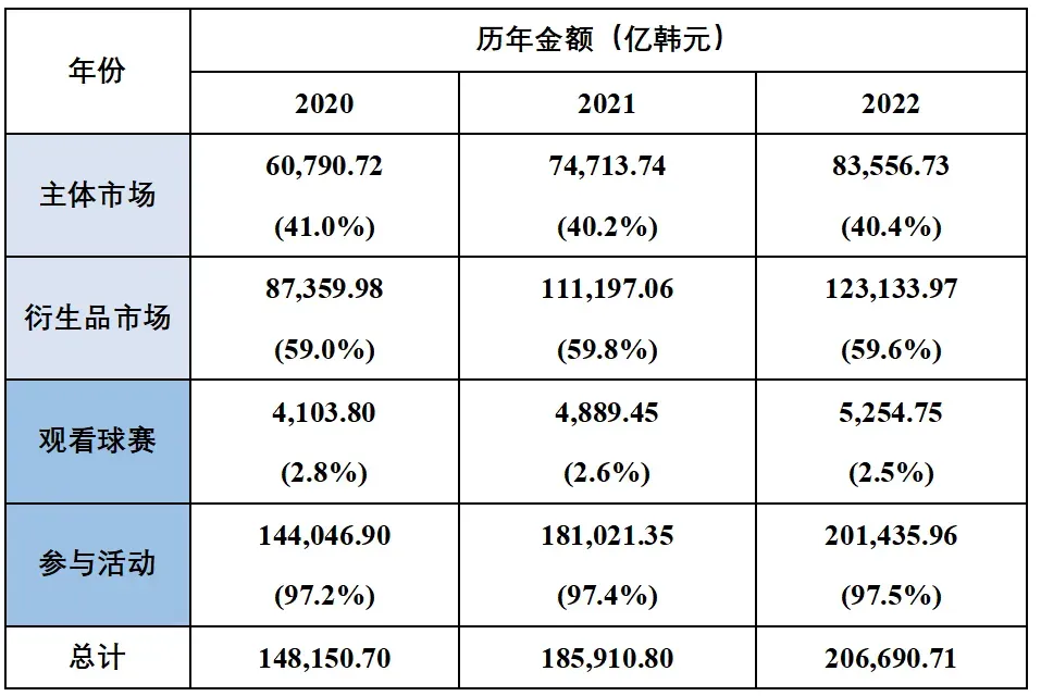 根据《Korea Golf Industry White Paper 2022》报告显示,2020-2022年,韩国高尔夫球产业实现了快速增长,展现出强劲的市场活力和高度成熟的消费特点,市场总规模由14.82万亿韩元(约合人民币712.6亿元)增长至20.67万亿韩元(约合人民币994.18亿元),年均复合增长率超过18%。韩国高尔夫球产业在全球主要高尔夫球市场中表现尤为突出,尤其是在新冠疫情期间逆势扩张,体现出其内需市场的旺盛。从市场结构来看,韩国高尔夫球产业由“主体市场”和“衍生品市场”构成。主体市场指的是球场运营、打球服务、模拟练习场等直接消费领域,2022年规模达83556.7亿韩元(约合人民币401.91亿元),占比40.4%,三年增长超过37%,反映出稳定的打球人口基础与持续增长的场地消费能力。衍生品市场包括球具、服饰、会员服务、培训、旅游等延伸业态,2022年规模达12.3万亿韩元(约合人民币592.27亿元),占比近60%,是拉动整体增长的主引擎。韩国高尔夫球消费已经从单一运动形式转向更加综合化的生活方式场景,涵盖零售、培训、娱乐、文旅等多元服务。