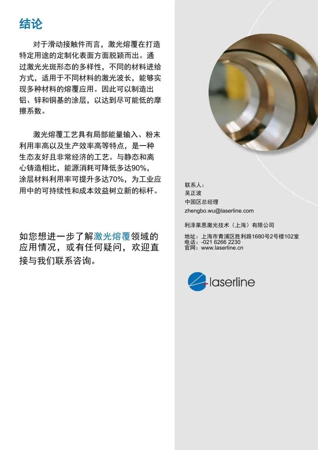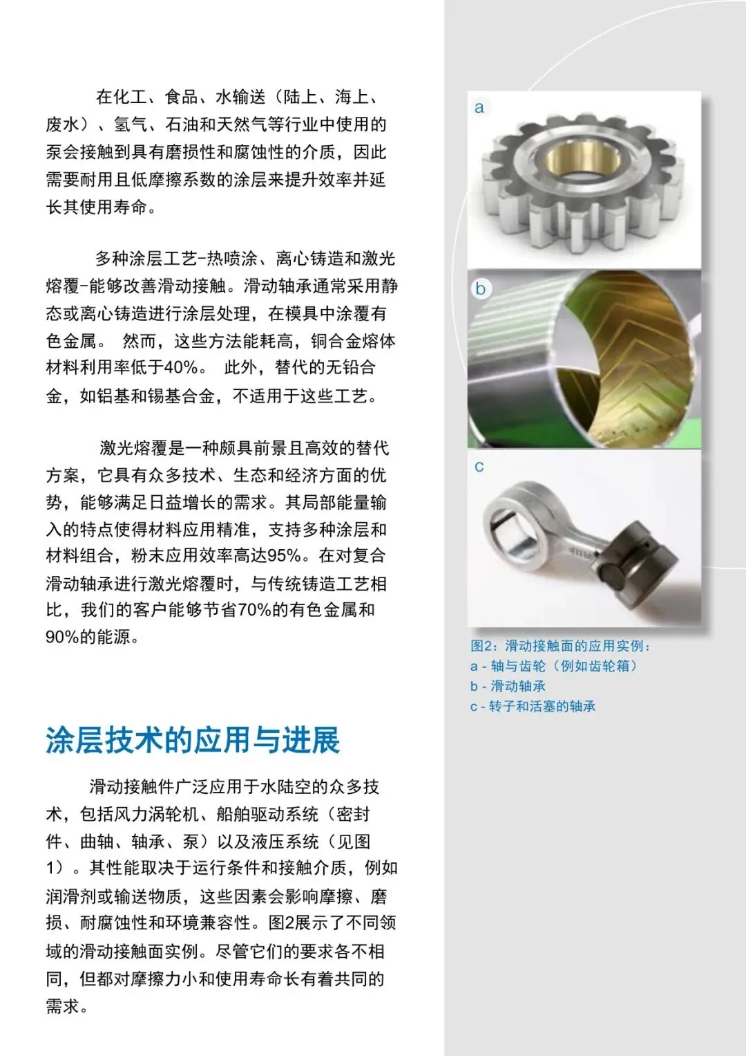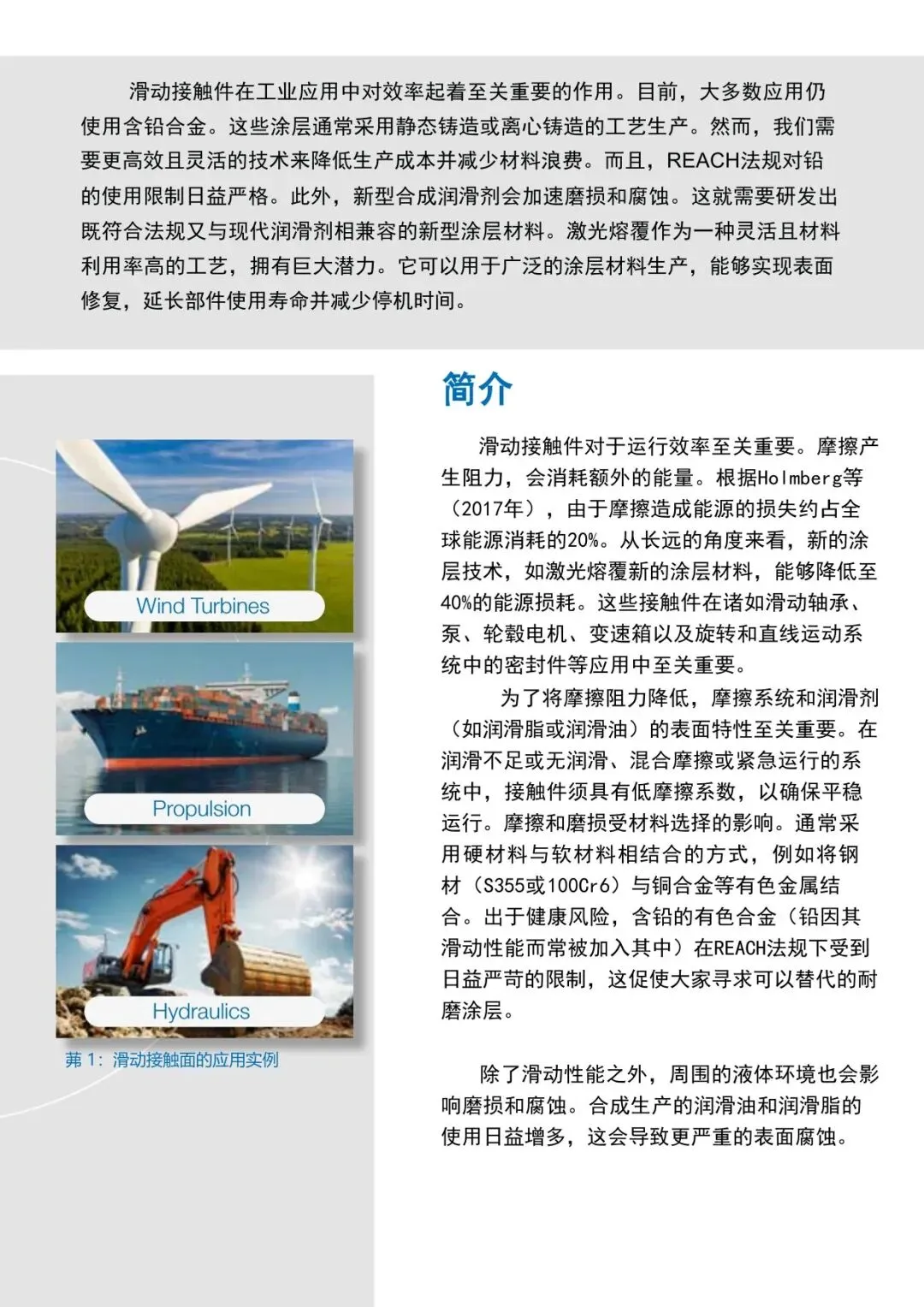 滑动接触件在工业应用中对效率起着至关重要的作用。目前,大多数应用仍使用含铅合金。这些涂层通常采用静态铸造或离心铸造的工艺生产。然而,我们需要更高效且灵活的技术来降低生产成本并减少材料浪费。而且,REACH法规对铅的使用限制日益严格。此外,新型合成润滑剂会加速磨损和腐蚀。这就需要研发出既符合法规又与现代润滑剂相兼容的新型涂层材料。激光熔覆作为一种灵活且材料利用率高的工艺,拥有巨大潜力。它可以用于广泛的涂层材料生产,能够实现表面修复,延长部件使用寿命并减少停机时间。