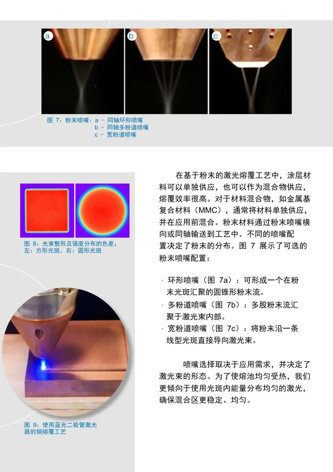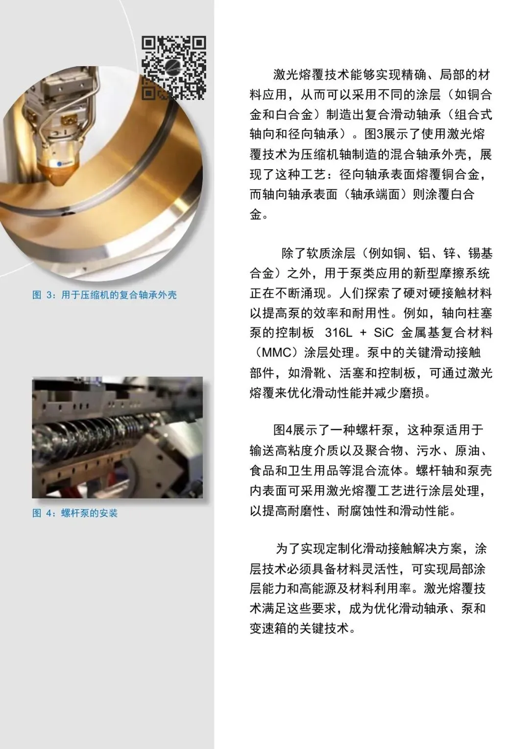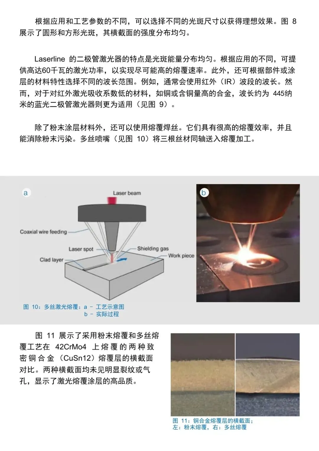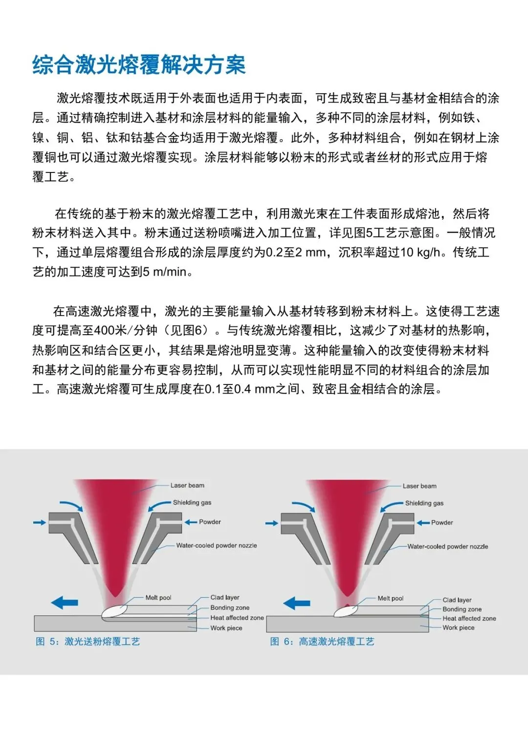 激光熔覆技术既适用于外表面也适用于内表面,可生成致密且与基材金相结合的涂层。通过精确控制进入基材和涂层材料的能量输入,多种不同的涂层材料,例如铁、镍、铜、铝、钛和钴基合金均适用于激光熔覆。此外,多种材料组合,例如在钢材上涂覆铜也可以通过激光熔覆实现。涂层材料能够以粉末的形式或者丝材的形式应用于熔覆工艺。