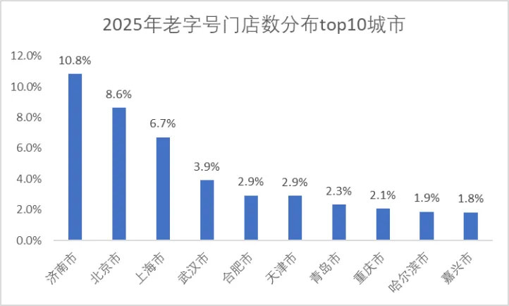 从区域分布看,中华老字号呈现出明显的区域集中态势。美团数据显示,华东地区门店数量占比达46%,接近全国总量的一半,其他地区占比均低于20%。具体分布为:华北地区19%、华中地区12%、西南地区10%,华南与东北地区各占5%,西北地区占3%。从具体城市分布看,济南市以10.8%门店数占比位居第一,北京和上海分别以8.6%和6.7%的紧随其后。“东密西疏、南少北多”的格局反映了老字号在全国范围内的地域市场高集中度。