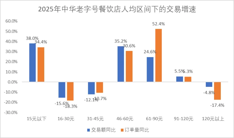 老字号消费市场呈现明显的结构性分化。消费者在选择老字号时更倾向于高性价比或高品质产品,中间价位产品吸引力相对不足。美团数据显示,15元以下商品交易额同比增长38.0%,订单量增长34.4%,这部分多集中在特色小吃的订单类型;46-60元价位交易额增长35.2%,订单量增30.6%;61-90元价位交易额增长24.6%,订单量增52.4%,这类订单多集中在家庭聚会、朋友小聚等场景。这三个区间均实现订单与交易额双增长,反映出老字号在品质升级、场景拓展方面取得的显著成效。中间价位整体表现疲软,16-45元和120元以上高价位的订单量下滑较为显著,其中人均16-45元消费区间的带宽较大,消费场景相对模糊, 120元以上人均消费对场景内容的要求也更为严苛;该区间表现得疲软意味着企业的数字化、精细化运营能力以及场景内容的塑造要求无法与市场需求完美契合,还有较大提升空间。