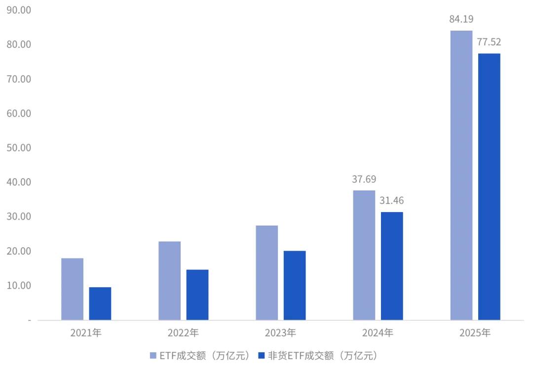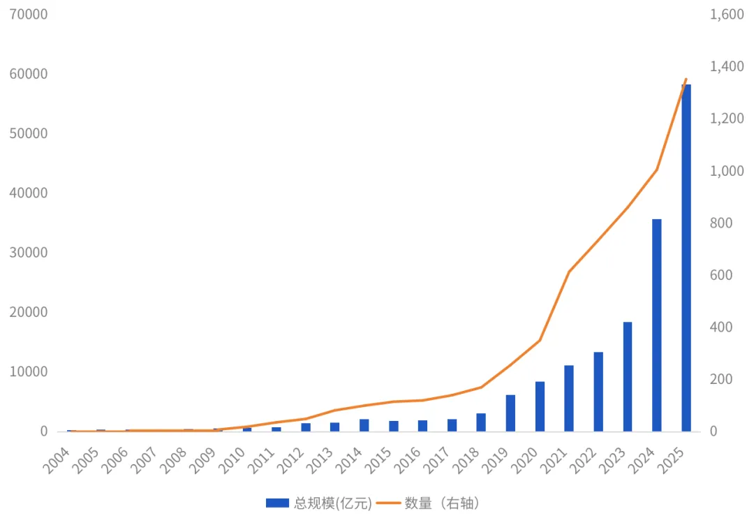 2025年初,证监会印发《促进资本市场指数化投资高质量发展行动方案》,中央金融办等六部委联合发布《关于推动中长期资金入市的实施方案》,明确提出大力发展权益类公募基金,进一步推动指数化投资发展。政策顶层设计为市场发展提供了明确方向,境内ETF市场发展不断提速。过去20年间,ETF市场总规模每增长1万亿分别用时16年、3年、9个月、7个月、4个月和4个月。截至2025年底,境内上市ETF共有1381只,总规模达到6.01万亿元。其中,非货币ETF产品数量为1354只,较2024年底净增加348只,合计资产规模为5.84万亿元,较2024年底增加2.28万亿元,增幅64%。ETF占股票市场流通市值比重由2024年底的4.58%提升至6.10%,在资本市场中发挥日益重要的作用。