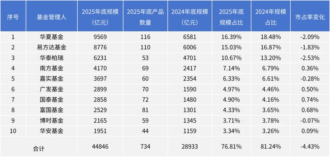 从基金管理人市场结构来看,部分基金管理人旗下ETF规模已逼近万亿大关。截至年底,境内共55家基金管理人开展非货币ETF业务。其中,排名前十基金管理人旗下非货币ETF规模合计4.48万亿,占市场总规模的76.8%,集中度较2024年底下降4.4个百分点,呈现良性分化态势。排名前五的基金管理人合计市占率为55.6%,集中度较2024年下降6.4个百分点。