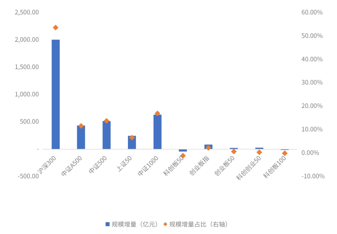 图7 境内前十大宽基指数对应ETF规模和增量占比