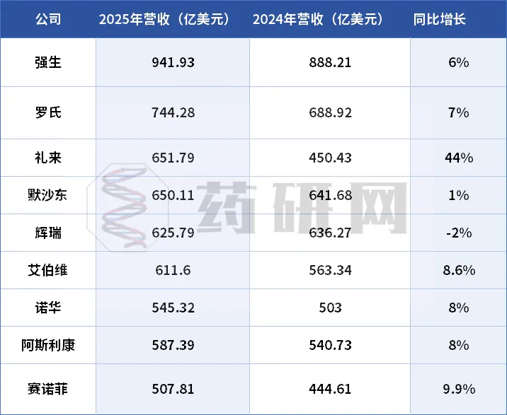 随着上一财年正式收官,全球制药企业陆续公布了2025年的财报答卷,根据业绩,我们整理出跨国药企TOP10业绩排名,梳理了各家跨国药企在中国市场的营收表现——阿斯利康再次霸榜跨国药企中国区营收TOP1!除总营收外,各大药企的“摇钱树”——重磅单品销售额也同步揭晓。目前小编已整理汇总《2025年跨国药企年报》,包含强生、罗氏、礼来、默沙东、辉瑞、赛诺菲、诺华、GSK等超20家企业财报及PPT介绍,并持续更新中。对话框回复 “2025年报汇总” 即可获得年报PDF汇总2025年全球营收TOP10榜单经历了新一轮洗牌。强生、罗氏发展势头保持强劲,稳坐前两名,礼来凭借减肥神药挤走默沙东“药王”宝座后,其总营收也跃升至前三,增幅高达44%,成为今年榜单最大“黑马”。“强生是唯一一家即将实现年收入超过1000亿美元的医疗公司。”