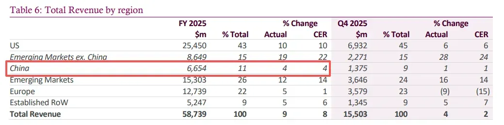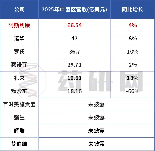 销售额超百亿美元的“重磅炸弹”药物是各自企业的“现金牛”,不仅在特定治疗领域占据着领先地位,还推动企业总营收实力的提升。以 GLP-1 为代表的代谢类药物的火热程度,已经远远超出了传统制药逻辑的理解边界。不同于以 Keytruda 为代表的肿瘤免疫药必须在特定疾病人群中“与死神赛跑”,GLP-1 类药物切入的是规模更庞大、更稳定、复购率更高的“类消费级”健康需求。正是这种底层逻辑的分野,使得药王的迭代速度首次进入消费品般的“高周转周期”。在这一轮迭代中,礼来的替尔泊肽以 365 亿美元的年销售额,略胜 GLP-1 第一代霸主司美格鲁肽的 355 亿美元,并稳稳超越传统药王 Keytruda 的 317 亿美元。替尔泊肽由此从 K 药手中接过全球“药王”接力棒,标志着 GLP-1 时代药王的全面来临。受益于这一趋势,礼来市值也成功突破万亿美元大关,再次巩固其在全球制药行业的领导地位。在已披露中国区业绩的跨国药企中,阿斯利康排名第一,连续二年坐上中国区“老大”的位置。根据阿斯利康2025财报数据,中国区收入66.54亿美元,同比增长4%,占公司总收入比11%,再创新高!