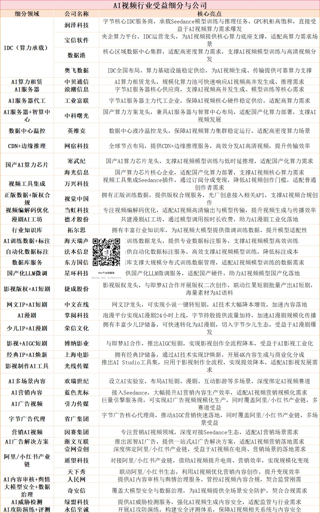 附表:AI视频行业受益细分及核心公司梳理