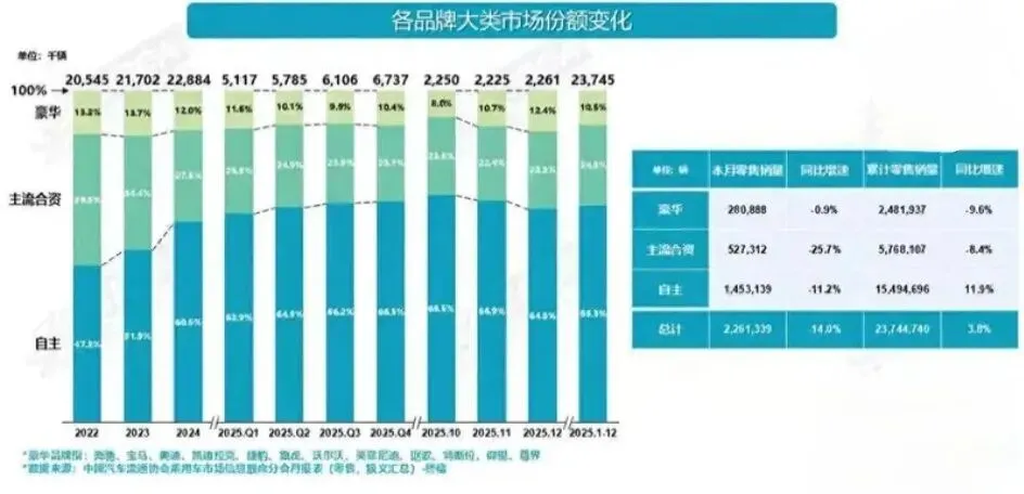 乘联分会最新数据给出了最直观的答案:2025年全年,合资品牌汽车整体销量仅782万辆,同比下滑12%,市场份额更是直接跌破35%关口,收于33%。冰冷的数字背后,是合资品牌集体陷入“量价齐跌”的尴尬困境,曾经不可撼动的燃油车时代绝对优势,早已在时代浪潮中烟消云散。