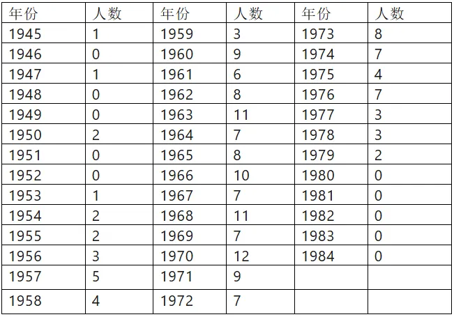我们先来看这份表格,统计对象是某评级机构2018年中国区榜单中所有一等(Band 1)或以上律师[1]。左边一列是出生年份[2],跨度为40年,自首个有入选律师的出生年份(1945年)起,至1984年终。右边一列是出生于该年份的律师的入选数量。
