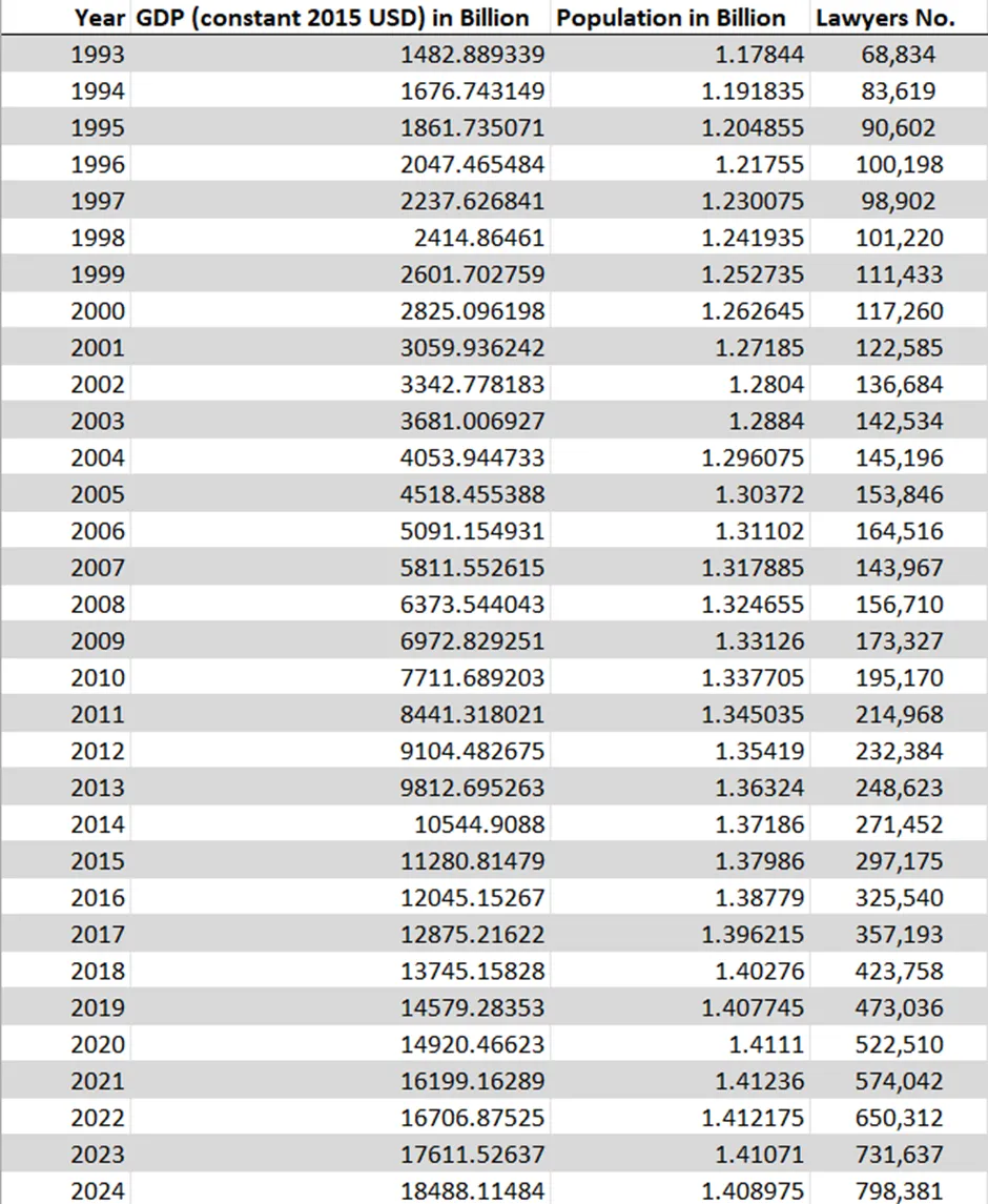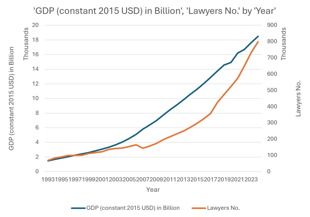 过去30年,人口持续增长至2021年,之后开始回落。GDP及律师数量保持持续增长。如果观察得仔细点,会注意到GDP和律师数量增长曲线的斜率在过去几年略趋同。