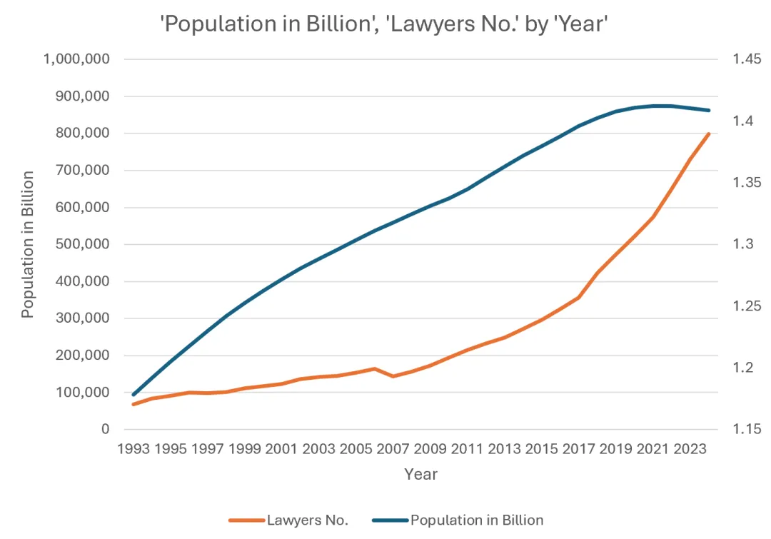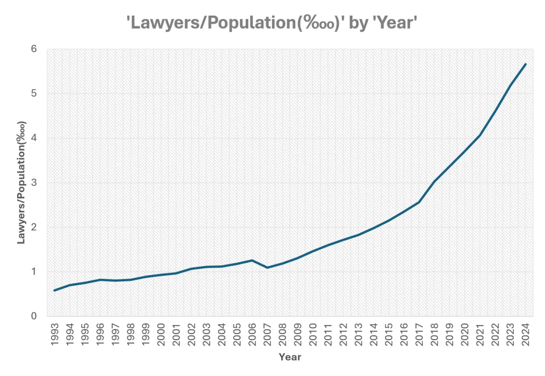 可以看到从1993年到2024年的约30年里,中国律师的密度从每万人中不到1名增加到每万人中超过5人。我们可以说,相比较30年前,现在的律师的确更多了。