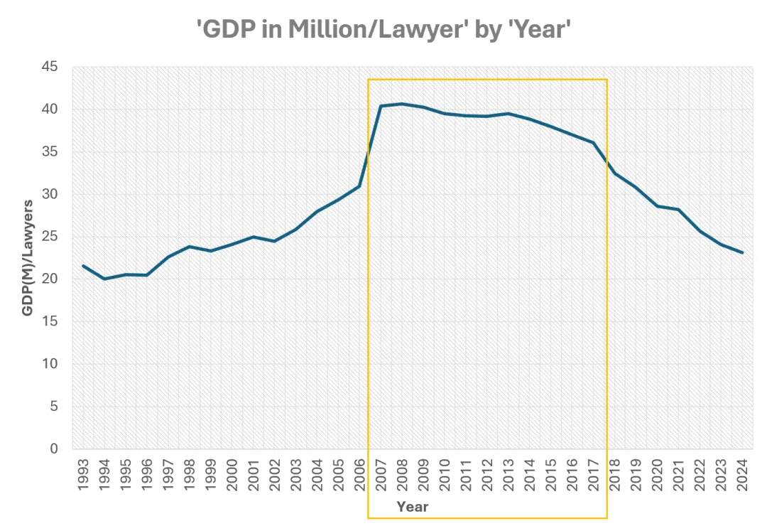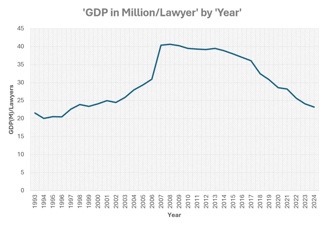 计算方式是将GDP除以律师数量,以计算出平均每个律师对应的GDP数值。我们可以用这个数值,来评估一个司法辖区内不同时期法律服务市场的健康度。背后的逻辑在于: 法律服务的需求,是需要足够的经济活动来支撑的;一个司法辖区的经济活动越发达,其对法律服务的需求也就越大,对律师行业的承托力也越强。