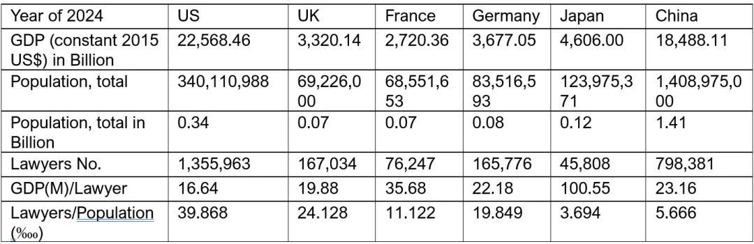 这是一份2024年美国、英国、法国、德国、日本和中国的横向数据比较表,列明了五个数据: 2015不变价美元GDP数据、人口、律师数量、律均GDP及律师密度。其中美国和英国属英美法系/普通法系国家、法国和德国属大陆法系国家、日本和中国同属东亚文化圈。法律体系、法律文化强度都会影响一个国家或地区的律师行业的业态,因此我们尝试将不同法系、不同文化背景的典型司法辖区放在一起,横向做一个比较,看看会有什么发现。