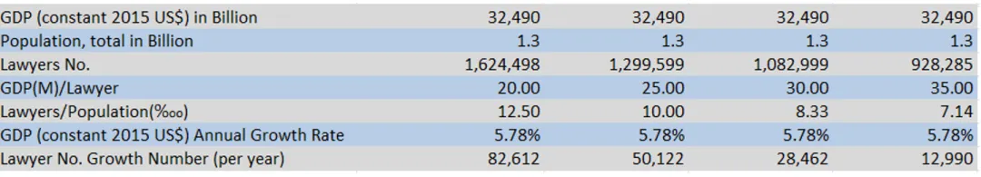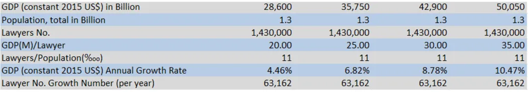假设我们有一个2034年需要达到的律师密度目标:每万人律师数量超过11人,这是一个接近但略低于目前法国的律师密度,以下是按不同律均GDP所做测算表。