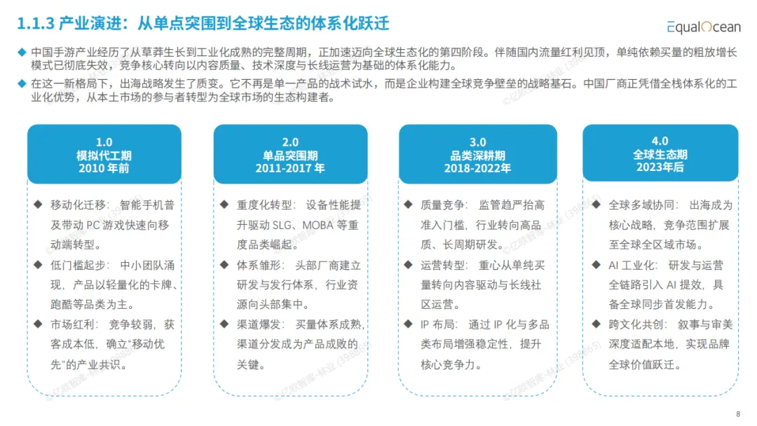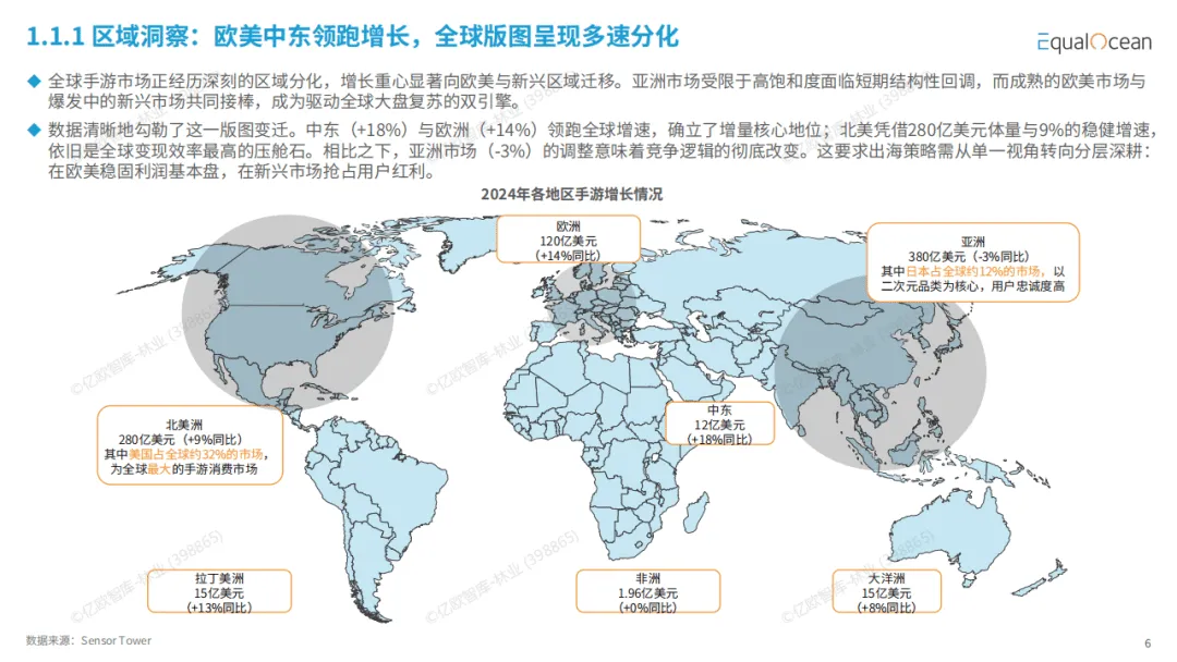 全球手游市场进入低增速稳态周期,国内存量竞争倒逼中国手游出海成为战略刚需,2025年中国自研手游海外收入稳步增长。海外市场呈现区域分化特征,欧美、中东增速领先,东南亚是核心拉新引擎,日韩为高付费成熟市场。出海模式已从买量扩张转向研发、发行、运营的体系化竞争,产品需实现全球适配而非简单本地化。厂商路径各具特色,腾讯以投资整合与全球发行平台为核心,米哈游聚焦IP生态全球化,中手游坚持IP驱动+分区深耕。行业趋势呈现文化共创、运营精细化特点,AI赋能研发与UGC创作,DTC模式重构渠道价值,IP跨界联动拓展生态边界。未来,具备可复制的全球化能力、跨文化叙事与长线运营能力的企业将脱颖而出。