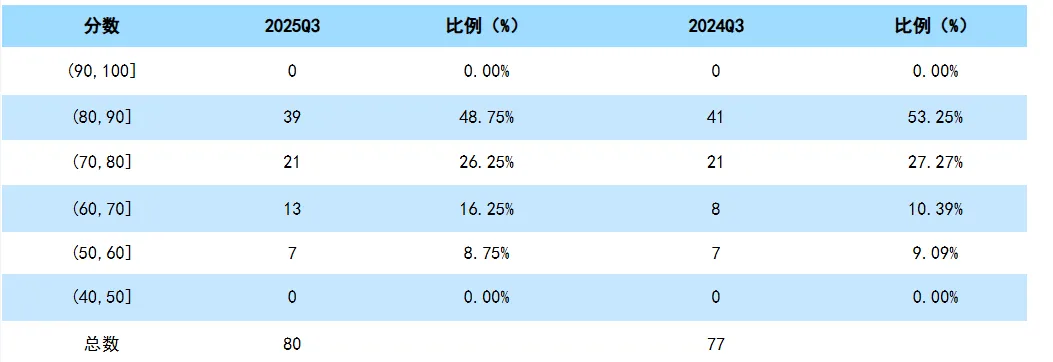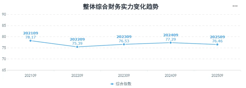 截至202509,在有历史同期数据可比对的77家公司中,17家综合财务实力等级上升,37家综合财务实力持平,23家综合财务实力下降。