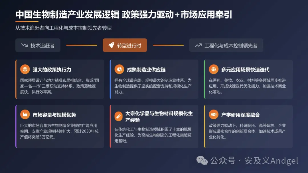 中国将在生物制造相关领域引领全球。美国代表前沿技术突破的创新,中国代表规模量产能力的跃升。也就是说,中国凭借集中力量突破、丰富的资源供给和产业化能力,将成为全球生物制造产业的主要引领者和核心驱动者,掌握产业供给能力和话语权。
