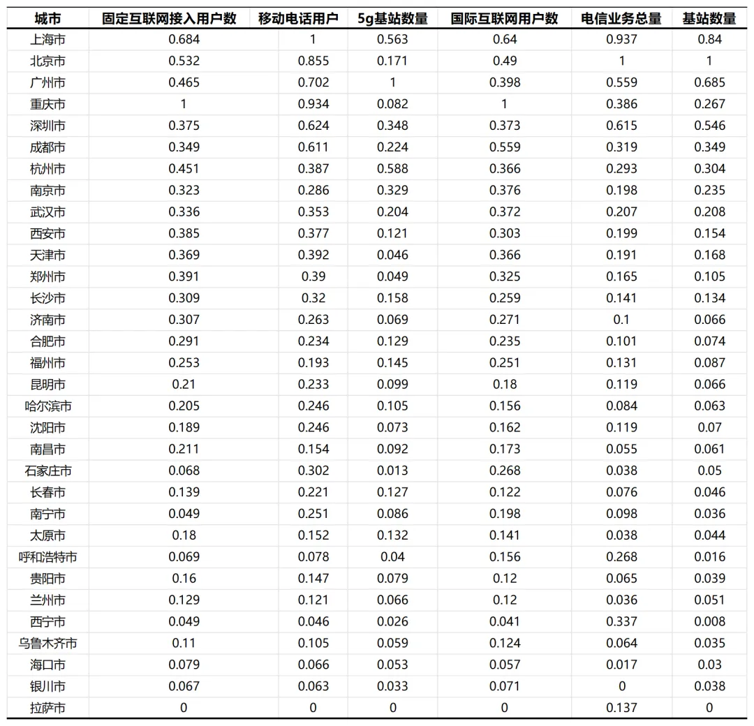 在数字经济基础设施建设方面,评估基于固定互联网接入用户数、移动电话用户、5G基站数量、国际互联网用户数、电信业务总量、基站数量六项核心指标。结果显示,上海和北京在基础设施供给能力上领先,而深圳在数字经济基础设施应用能力上对比超一线城市有待提升。