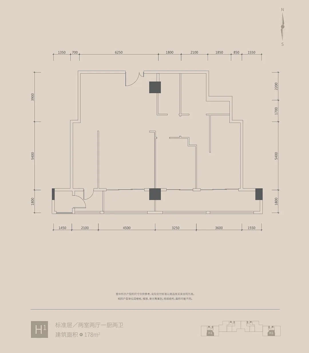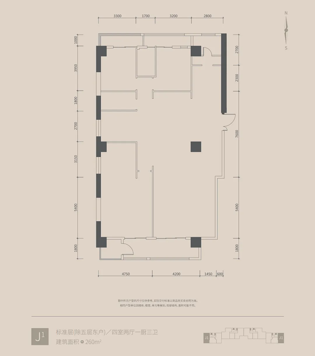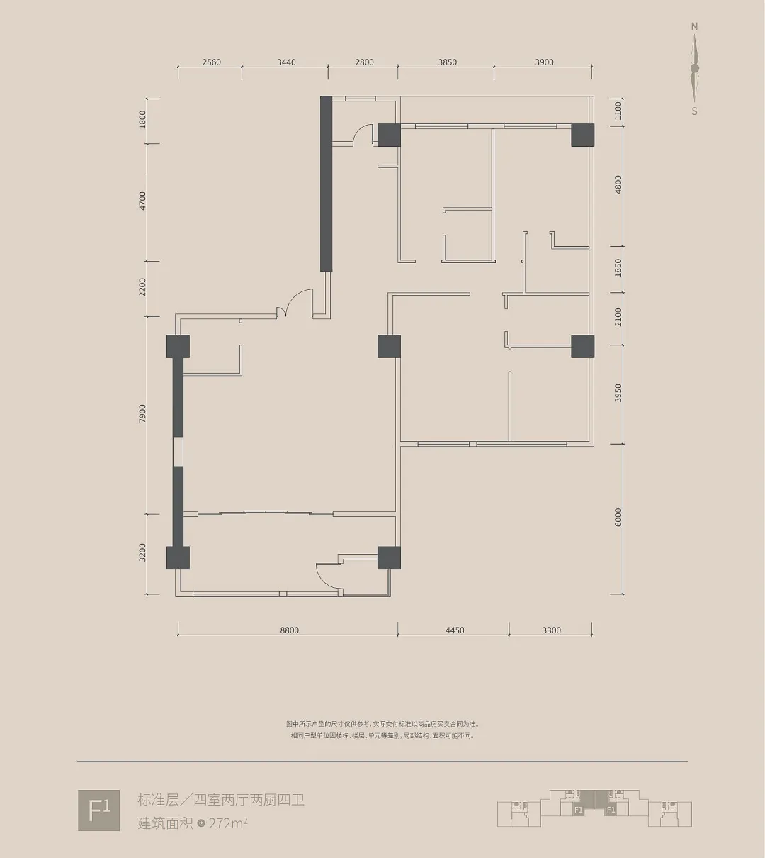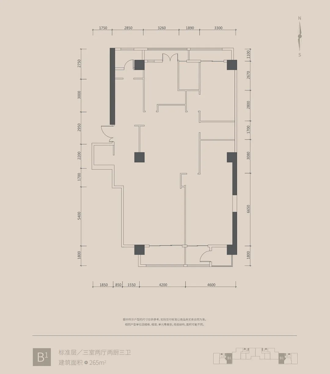 1#(4-16层):2梯3户,总计120套,主力户型6个,主力面积178-307㎡: