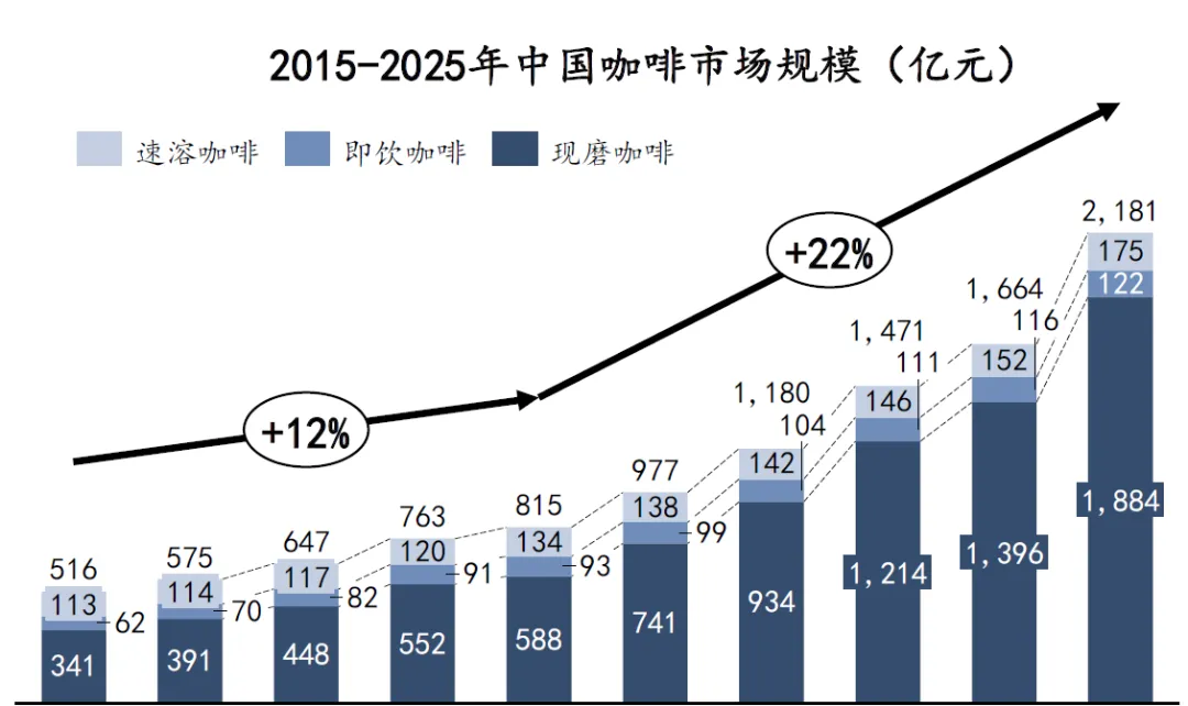 中国咖啡市场规模2,181亿元,其中现磨咖啡市场超1,880亿
