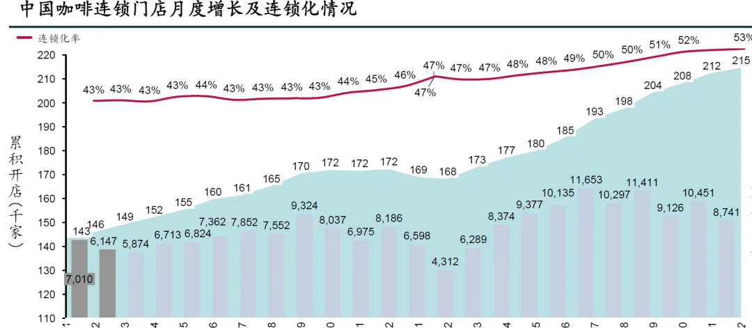 2025年中国咖啡门店数净增4万多家,达到21.5万家,增幅25%;连锁化