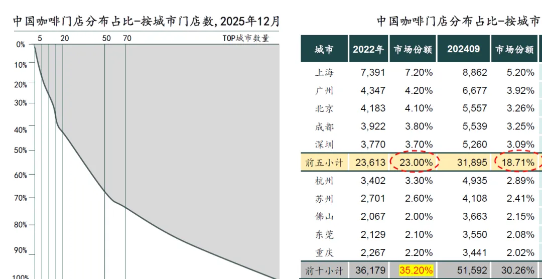 趋势三:下沉市场开店加快,咖啡门店数前十城市25年门店占比