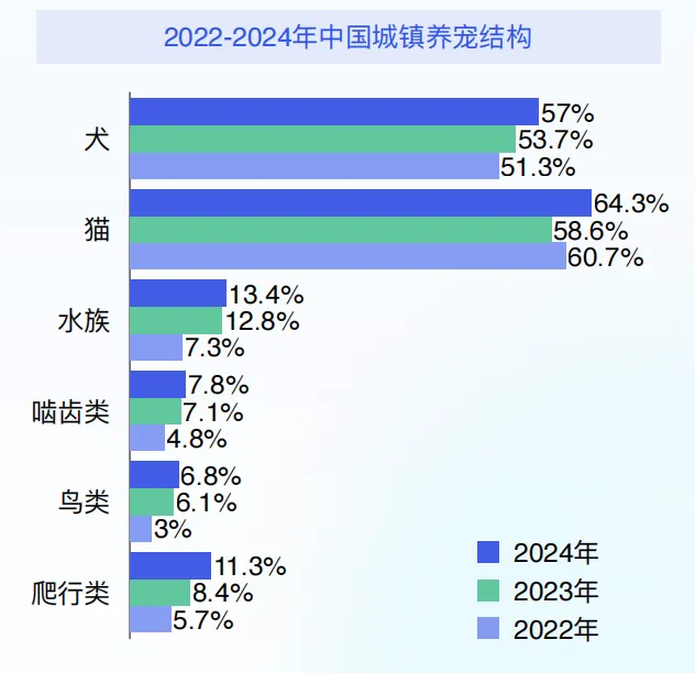 目前,养狗和养猫的家庭占比均超过50%,它们仍是大多数人的首选。但与此同时,水族、爬行类等小众宠物的饲养比例也在缓慢增长,显示出养宠偏好正变得越来越多样化。
