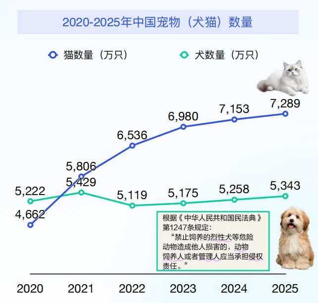 近年来,受城市养犬管理规定的影响,宠物犬的数量增长逐渐平稳。而宠物猫的数量则从2020年的约4862万只,快速增长到2025年的7289万只。
