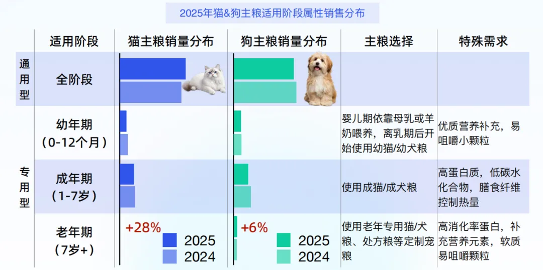 在功能上,关节护理、体重管理等具有明确健康指向的产品销量显著提升。尤其值得关注的是老年期专用粮——2025年,猫用老年主粮销量同比增长28%,狗用也增长6%,宠物“养老”市场正在快速打开。