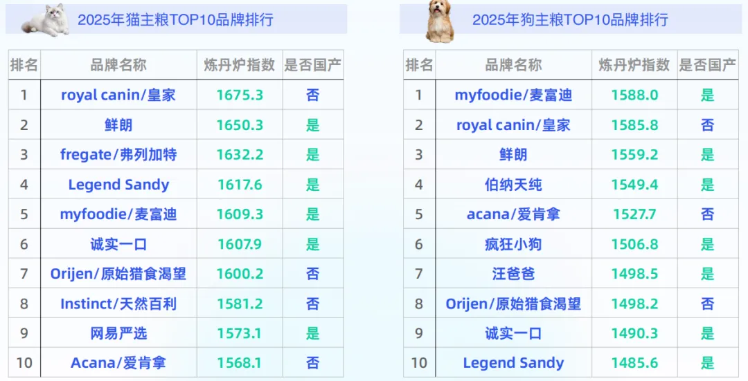 在狗粮市场,国产品牌已占据主导地位。猫粮高端领域虽仍有国际品牌的身影,但鲜朗、麦富迪、诚实一口等国货已成功跻身头部榜单,显示出强劲的竞争力。