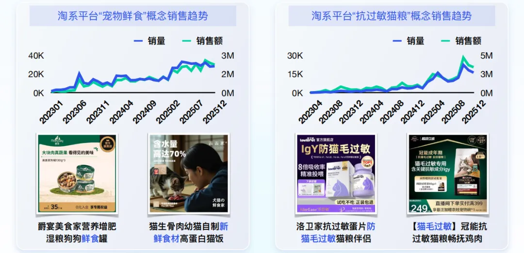 “宠物鲜食”持续走红,主人愿意为爱宠更新鲜、更健康的饮食买单;“抗过敏猫粮”则精准解决了“猫毛过敏”这一人宠共居难题,凭借生物技术打开高价值细分市场。