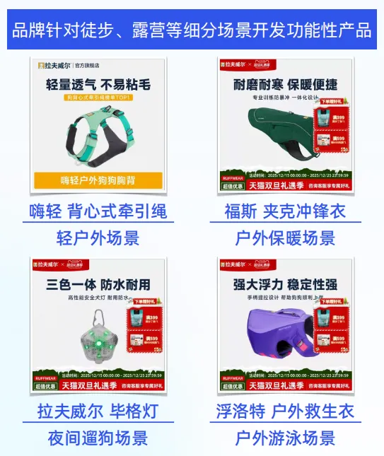 越来越多人愿意带宠物参与户外活动,相关话题在社交平台热度攀升。品牌也针对徒步、露营等场景,推出轻便牵引绳、宠物冲锋衣、救生衣等功能性产品,宠物成为户外生活的“时尚伴侣”。