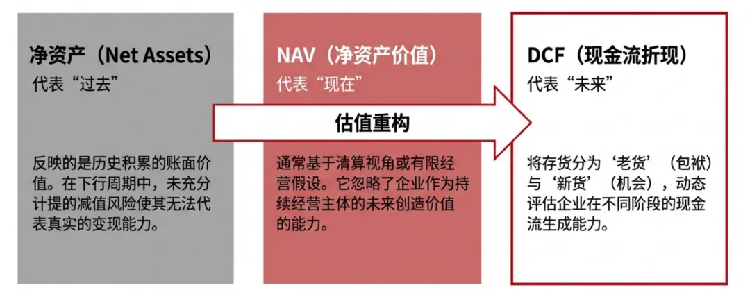 报告指出,传统的净资产(代表过去)和NAV(净资产价值,代表现在)估值法均隐含清算视角或有限经营假设,存在瑕疵。面向未来的DCF框架更适合界定价值中枢。