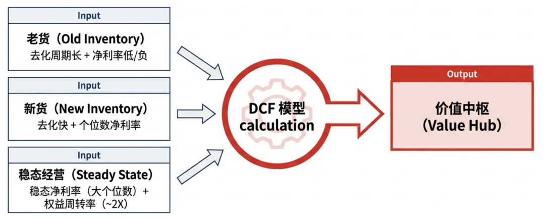 • 折现价值: 若老货去化周期在5年左右,其折现值约为0.68。