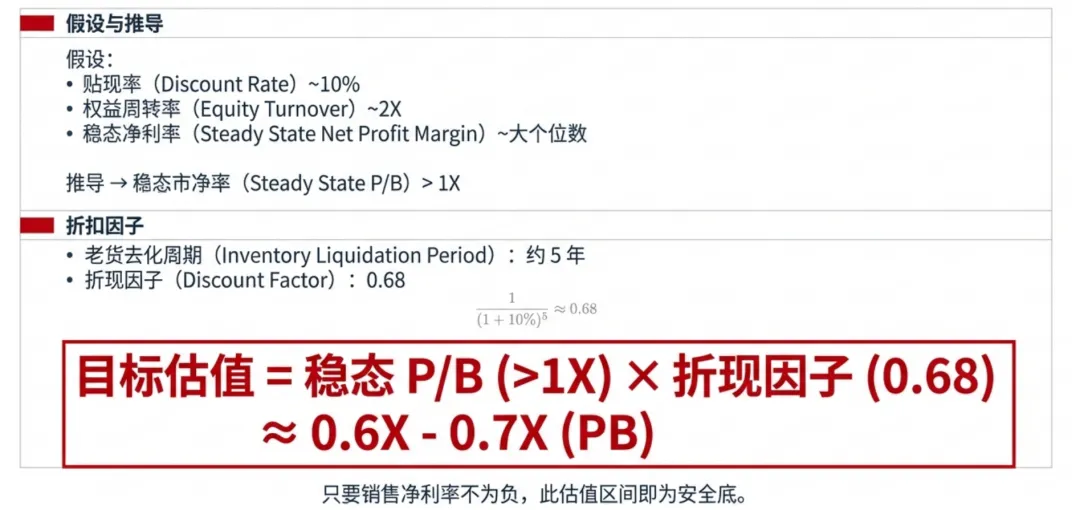• 稳态市净率: 若稳态净利率为大个位数,周转率2X,贴现率10%,稳态市净率有可能超过1X。