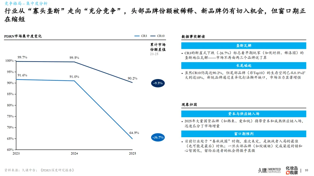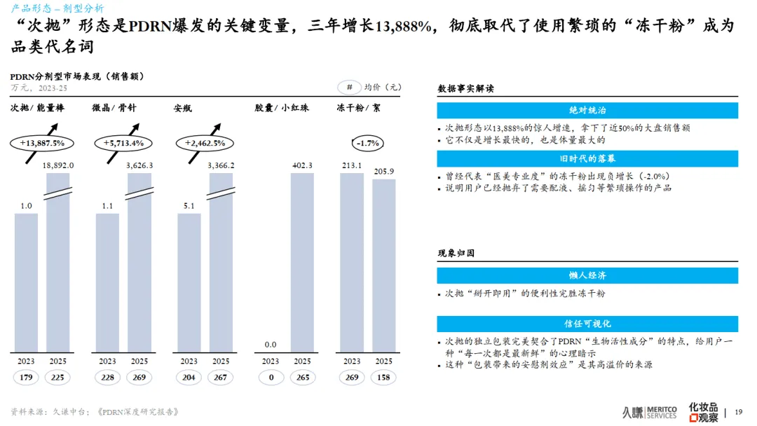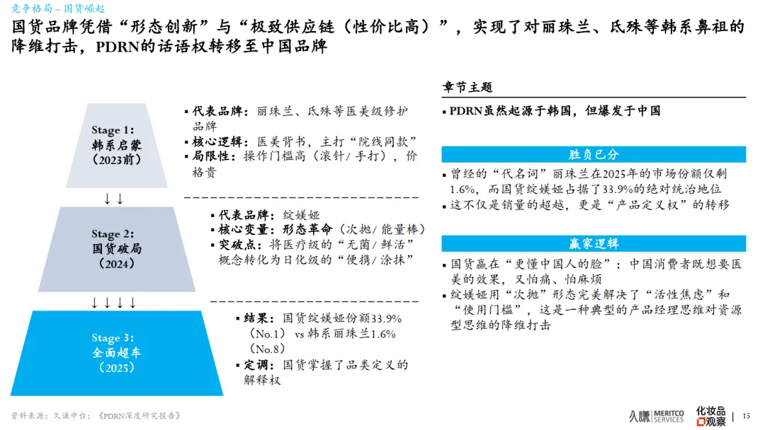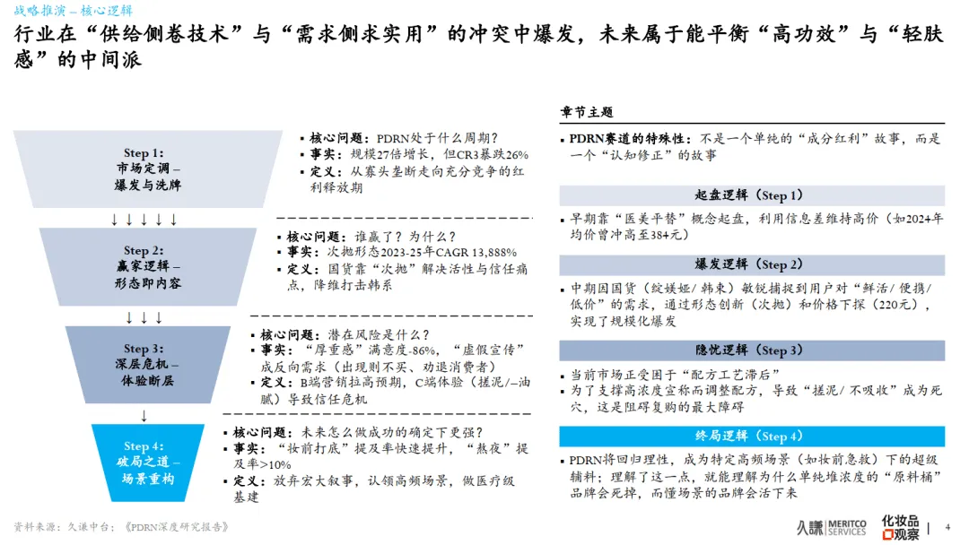 2023-2025 年 PDRN 护肤市场实现 27 倍爆发式增长,从医美小众品类跃升为大众超级品类,国货凭借形态创新与供应链优势实现对韩系品牌的降维打击,但行业同时面临供需错位、体验断层的深层矛盾,2026 年起将进入分化洗牌的存量博弈阶段,体验精耕与资质合规成为核心竞争点。