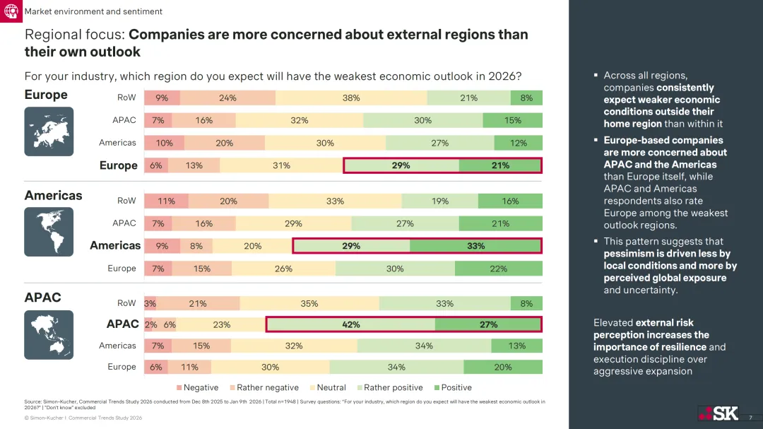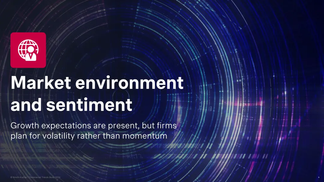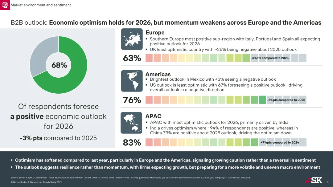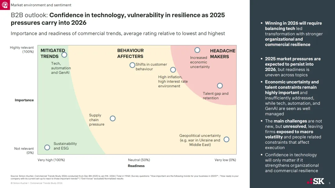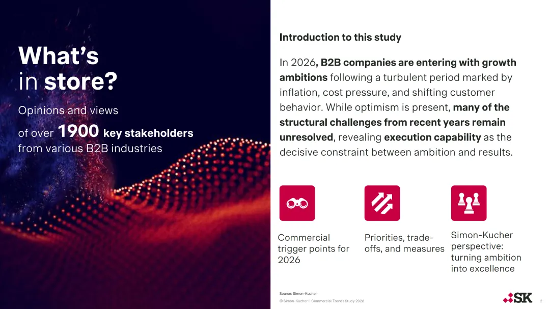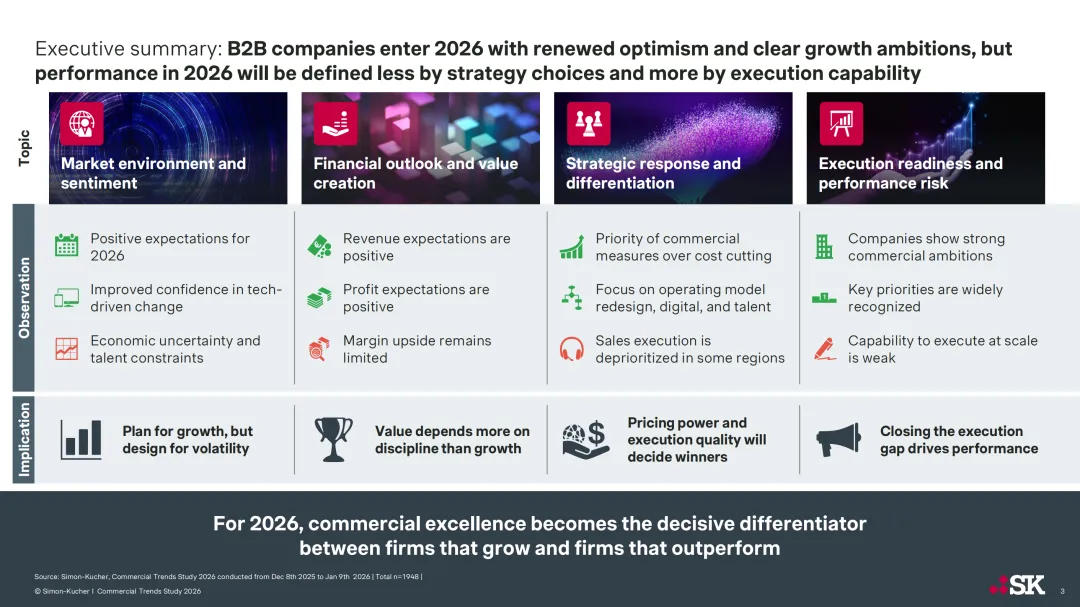 Simon-Kucher 于 2025 年 12 月至 2026 年 1 月对 1948 名 B2B 行业关键利益相关者开展调研,发布 2026 年商业趋势研究报告,指出 2026 年 B2B 企业虽怀揣增长雄心且整体预期乐观,但此前通胀、成本压力等结构性挑战仍未解决,企业执行力成为衔接增长目标与实际成果的核心制约因素,商业卓越性也成为企业增长与超额表现的关键差异化要素。