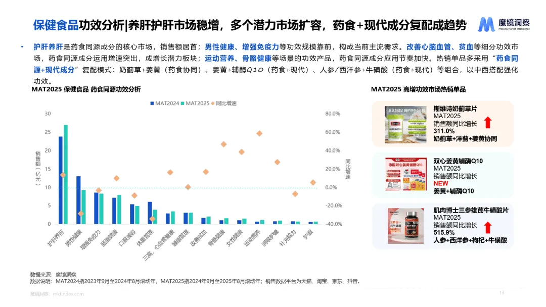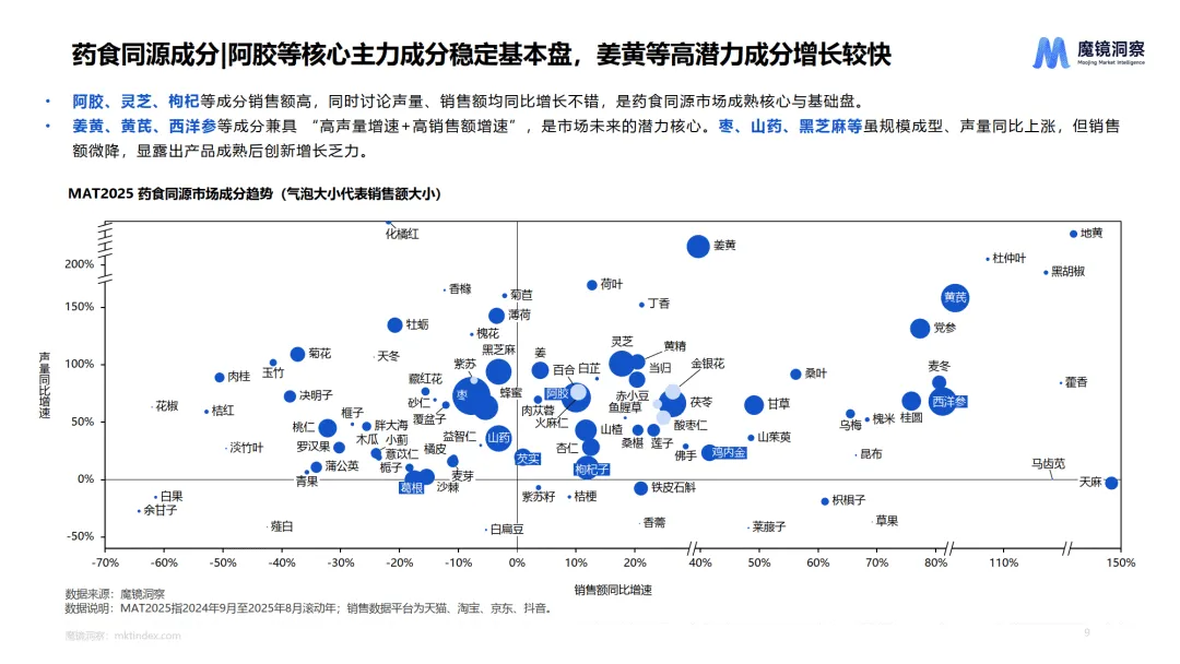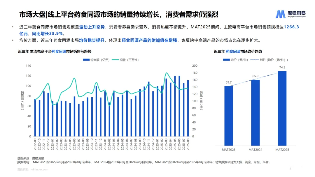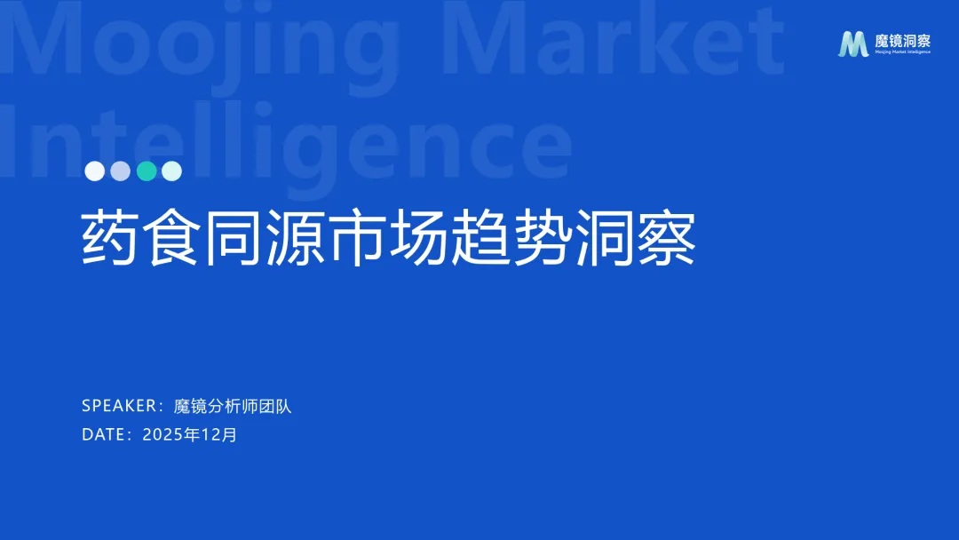 2025 年 12 月魔镜洞察发布的药食同源市场趋势报告显示,国民健康意识提升推动药食同源市场迎来高速发展期,市场规模扩容、消费需求多元、产品创新升级成为核心特征,行业正从泛养生向精准化、便捷化、场景化转型。
