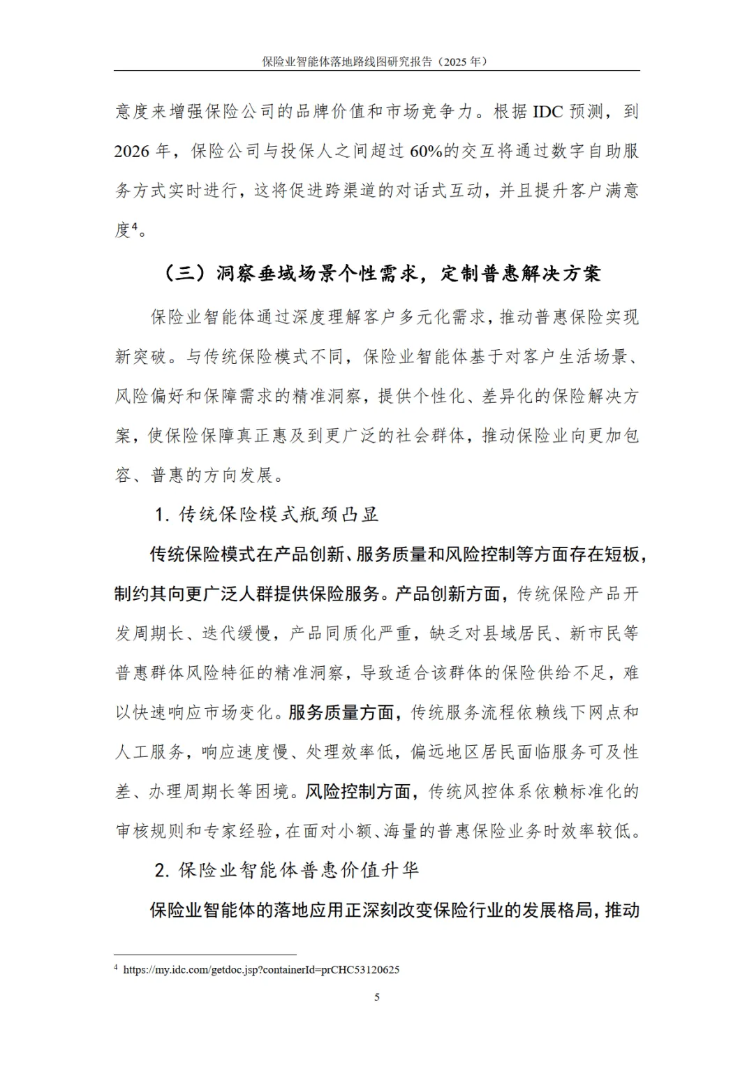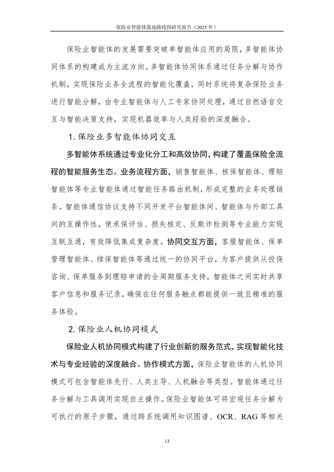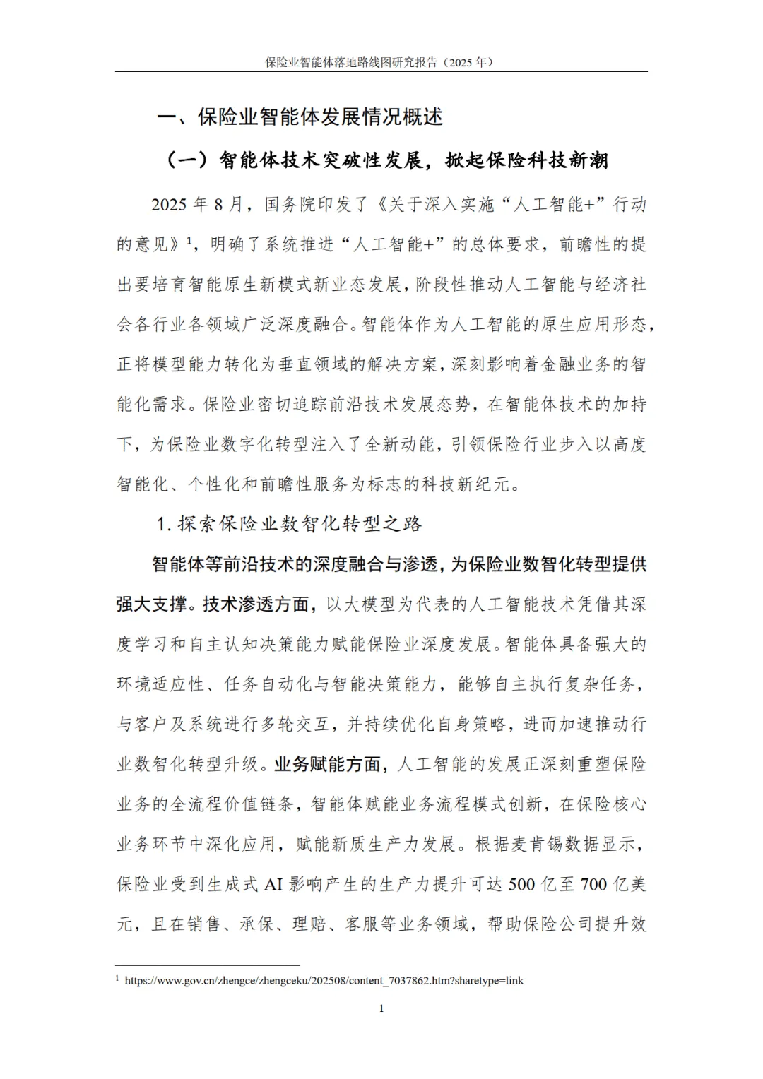 报告指出,智能体技术的突破性发展为保险业数智化转型注入新动能,其能重塑保险核心业务流程,实现服务从被动响应到主动守护的转变,还可精准洞察客户需求,破解传统保险产品同质化、服务可及性低等瓶颈,释放普惠价值。据行业数据,生成式 AI 可为保险业带来 500-700 亿美元生产力提升,2026 年超 60% 保险交互将通过数字自助服务完成。