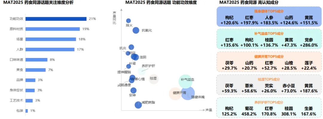用户关注集中于功能功效:补气血、强健体魄、健脾开胃等传统功效声量稳定;降火、抗氧化等功效增速明显。枸杞、红枣、党参等成为高认知成分。