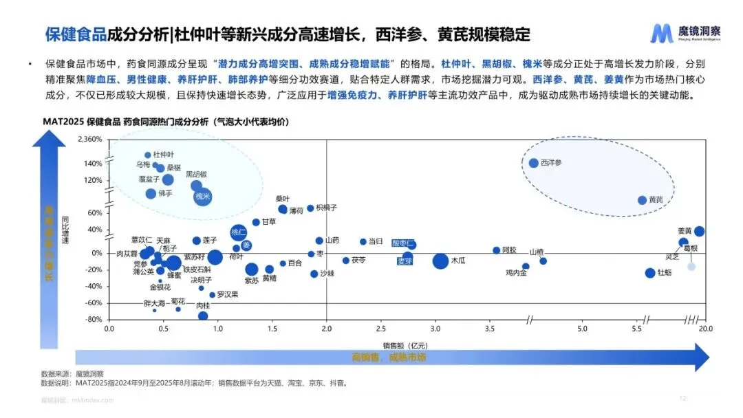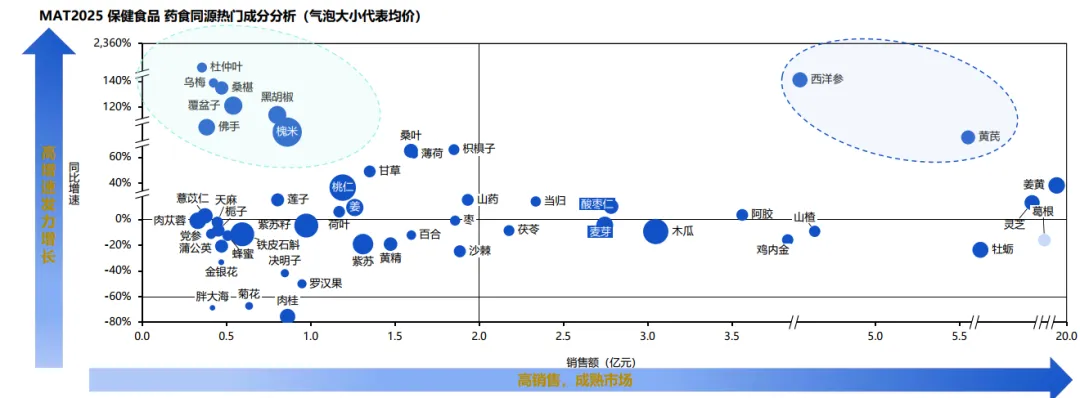 成分趋势:杜仲叶、黑胡椒、槐米等新兴成分高速增长,对应降血压、男性健康等细分功效;西洋参、黄芪、姜黄规模稳定且增速高。