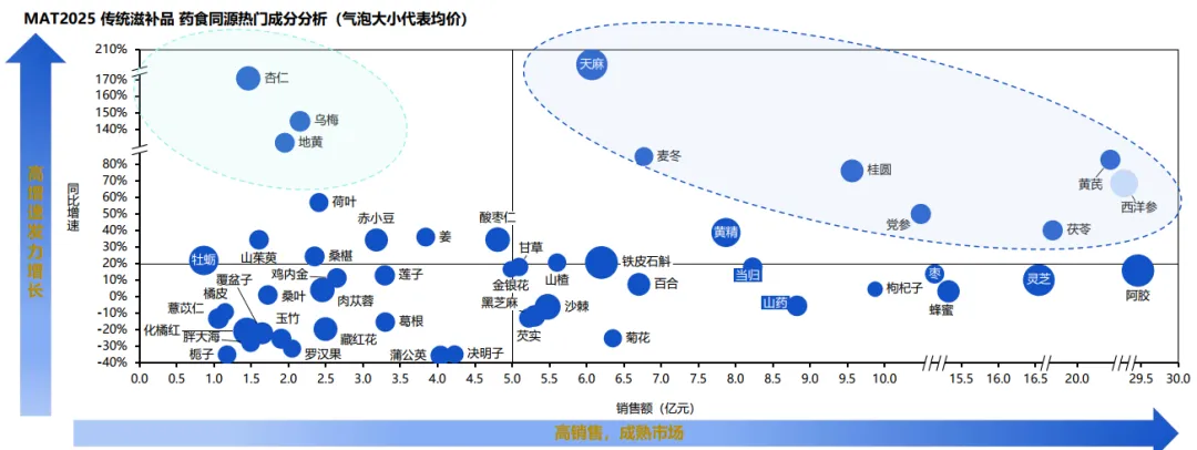 成分增长:杏仁、乌梅、地黄等小众成分增速超100%,对应养颜美白、肠胃调节等需求;天麻、麦冬、桂圆规模与增速双高。