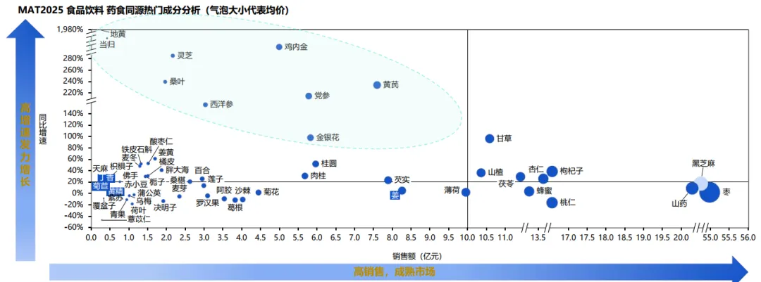 成分表现:地黄、当归增速迅猛;灵芝、黄芪、党参已具规模且持续增长;枣、山药、黑芝麻为基础大盘成分。