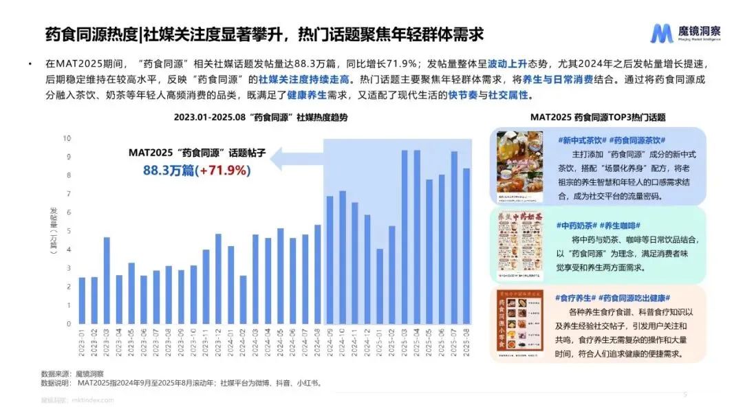 社媒热度显著上升:MAT2025期间“药食同源”相关话题发帖量达88.3万篇,同比增长71.9%,热门话题聚焦年轻群体,如新中式茶饮、中药奶茶、食疗养生等。