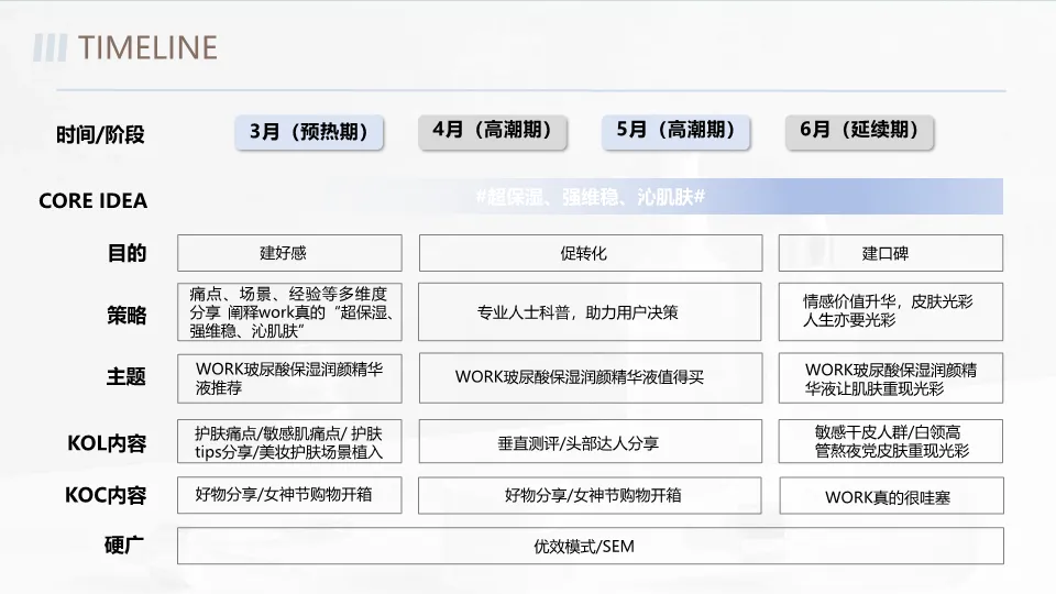 本方案为沃克护肤品牌制定的小红书整合营销传播方案。方案首先分析了护肤品行业趋势,指出功效导向、成分关注、医研共创是核心趋势,且小红书是护肤内容的第一心智渠道。基于此,方案提出以“超保湿、强维稳、沁肌肤”为核心卖点,通过分阶段(预热、高潮、延续)的爆文营销策略,结合KOL/KOC矩阵,从敏感肌、干皮、妆前等多元场景切入,直击用户痛点。同时,规划了官方账号运营、社群营销及私域转化路径。最终方案总预算30.8万元,旨在实现高曝光与用户沉淀。