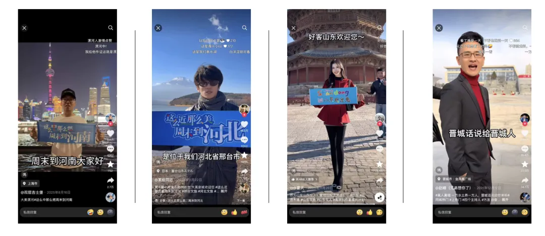 与之呼应的官方账号似乎也希望在该领域乘风借势,在文旅宣传领域,河南、河北、山东、山西组成的“山河四省”展现出了独特的集体创作特点。为了争夺流量,其官方文旅账号采用了“土味喊麦”,除了河北的这么近那么美周末来河北外,山东的“俺姓东”、还有各地区的“题海战术”(用极高频率更新视频)以及扶持区域网红等非常规策略。这种创作虽被部分网友质疑“土”、“俗”,但确实在短时间内制造了巨大声量,体现了地方政府在短视频时代主动适应网络语态、进行营销创新的尝试。这说明在特定目标和场景下,地域创作风格可以迅速趋同并形成风潮。
