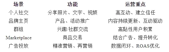 覆盖个人内容分享、商业主页、群组、Marketplace 及广告生态。