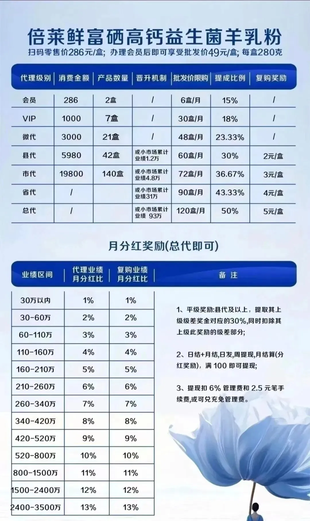 政策端:十四五 / 十五五双加持,羊乳粉千亿赛道确定性增长; 产品端:17 项专利、羊奶之父领衔、新国标顶配、沙盒试点合规,差异化无法超越; 模式端:新零售 5.0 零囤货、低门槛、业绩不归零,普通人轻松参与; 收益端:多元奖励 + 复购流水 + 团队分红,已帮助数十万普通人实现稳定增收。